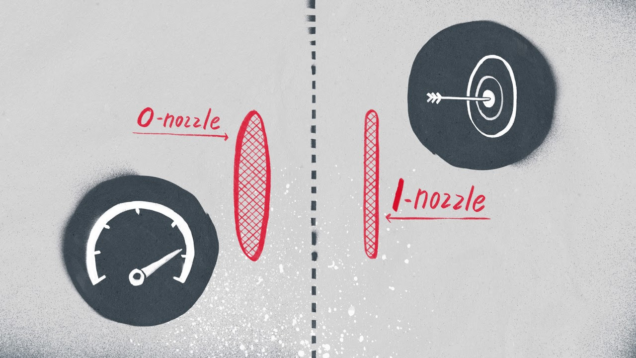 "I"-Düsen haben stattdessen ein paralleles Sprühfächermuster mit einer kleineren Trockenzone und einem kleineren Kern, was ideal für Lackierer ist, die eine reduzierte Auftragsgeschwindigkeit und eine maximale Auftragskontrolle während des Lackierprozesses bevorzugen. Der Filmaufbau ist pro Schicht gegenüber einer "O"-Düse gleicher Größe leicht reduziert.